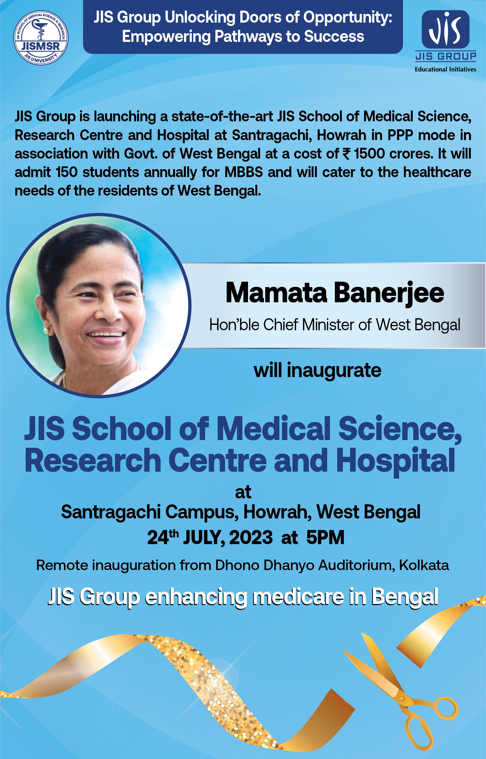 The JIS School of Medical Science and Research, currently aligned with Howrah District Hospital, is poised for a momentous remote inauguration from the Dhono Dhanyo auditorium, Kolkata, on July 24, 2023, by the Honourable Chief Minister, Smt. Mamata Banerjee. Several Ministers-in-Charge and top government officials will grace the event. With the endorsement of the esteemed National Medical Council, the institution shall annually accommodate 150 aspiring medical students.